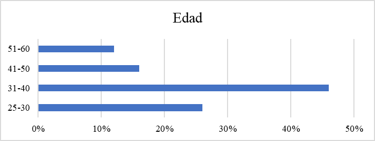 Interpretación: Se denoto la persistencia de mujeres dentro de la muestra docente, lo cual es una categoría relevante dado que este dato suele ser común en muchas regiones educativas en el país. Esta diferencia significativa denota que aun cuando los hombres educadores representan una proporción importante en el contexto, las mujeres conforman la mayoría en relevancia así los criterios se verán mayormente influenciado por este carácter.