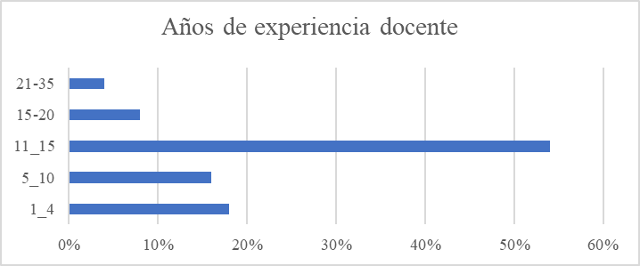 Interpretación: La mayoría de los docentes (54%) tienen entre 11 y 15 años de experiencia, lo cual indica un nivel de experiencia considerable en la profesión. Una proporción significativa también tiene entre 1 y 10 años de experiencia, sugiriendo una presencia de docentes en diferentes etapas de su carrera. La baja representación en los rangos de mayor experiencia (más de 20 años) puede indicar una rotación o renovación del personal, o una tendencia a mantener docentes en niveles de experiencia intermedios.
