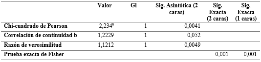 El valor del chi-cuadrado de Pearson (2,234) con un nivel de significancia bilateral de 0,0041 indica que existe una asociación estadísticamente significativa entre las variables analizadas, lo que respalda la hipótesis de que la intervención o los factores relacionados con la psicoeducación y el comportamiento de los estudiantes con TND están relacionados. La razón de verosimilitud y la prueba exacta de Fisher también confirman esta relación, con valores de significancia muy bajos (0,001). La correlación de continuidad de 1,2229 con un p=0,052, aunque cercana al nivel de significancia convencional, sugiere una tendencia a la asociación, pero con menor fuerza. En conjunto, estos resultados estadísticos refuerzan la conclusión de que las variables relacionadas con la psicoeducación a docentes y el comportamiento de los alumnos con TND están significativamente relacionadas, aunque la magnitud de la relación puede variar según el análisis estadístico utilizado. La evidencia respalda la pertinencia de implementar programas de capacitación y estrategias psicoeducativas en contextos escolares con alumnos que presentan TND, dado que existe una relación estadísticamente significativa que puede traducirse en mejoras conductuales y académicas.