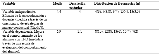 • Docentes de educación primaria y secundaria con experiencia comprobada en la enseñanza de alumnos con TND. Esta experiencia se justifica para asegurar que los participantes tengan conocimientos previos y habilidades en el manejo de esta población, lo cual favorece la calidad de la intervención. Además, al exigir experiencia previa puede haber sesgado la muestra hacia docentes ya relativamente capacitados o conscientes del manejo conductual, lo cual influiría en los resultados (por ejemplo, docentes sin experiencia podrían haber mostrado mayores cambios con la formación).