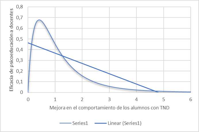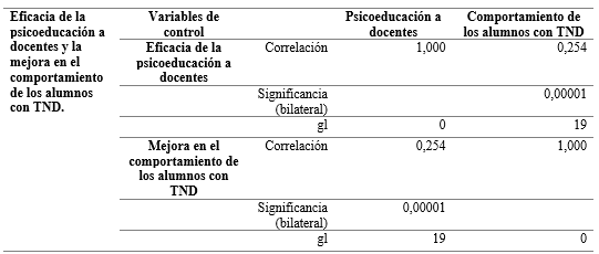 La correlación de 0,254 entre el efecto de la psicoeducación a docentes y la mejora en el comportamiento de los alumnos con TND, aunque moderada, es estadísticamente significativa (p=0,00001). Esto indica que la implementación de programas de psicoeducación tiene un impacto positivo en los comportamientos de estos alumnos, aunque el efecto no es de magnitud muy alta, sugiriendo que otros factores también influyen en la conducta. La relación, aunque débil, es relevante desde el punto de vista práctico, pues confirma que la capacitación y sensibilización de los docentes contribuyen a mejorar el comportamiento de los estudiantes con TND. La significativa correlación también sugiere que el cambio en la percepción y habilidades de los docentes puede traducirse en intervenciones más efectivas, favoreciendo ambientes escolares más positivos y adaptados a las necesidades de estos alumnos. Es importante considerar que la psicoeducación puede ser uno de varios componentes necesarios para facilitar cambios conductuales sostenibles en este grupo.